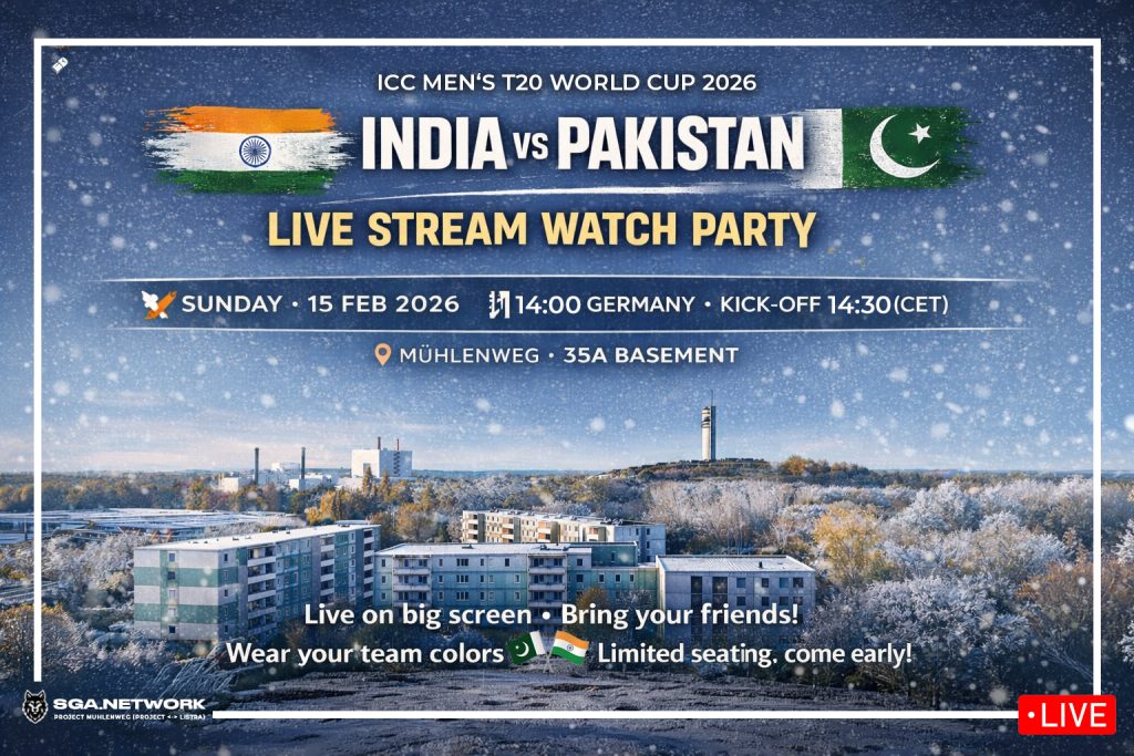 One of the biggest rivalries in world cricket is happening this Sunday, and we’re streaming it together in the basement! Whether you’re supporting India, Pakistan, or you’re just here for the atmosphere, everyone is welcome! This is a great chance to hang out, meet people in the dorm, and enjoy the match on a big screen with proper sound. 📍 Venue Mühlenweg 35A – Basement 📅 Date Sunday, 15 February 2026 🕒 Time (Germany) 14:00 onwardsKick-off: 14:30 (CET) 🎉 What to expect Live stream on big screen + sound A fun dorm atmosphere Bring your friends Wear your team colors 🇮🇳 🇵🇰 ⚠️ Limited seating – come early to grab a spot! 👉 Free for all, no entry fee 🆓 See you in the basement! 🔥 (bring your own chair) 🪑 Where to find us: